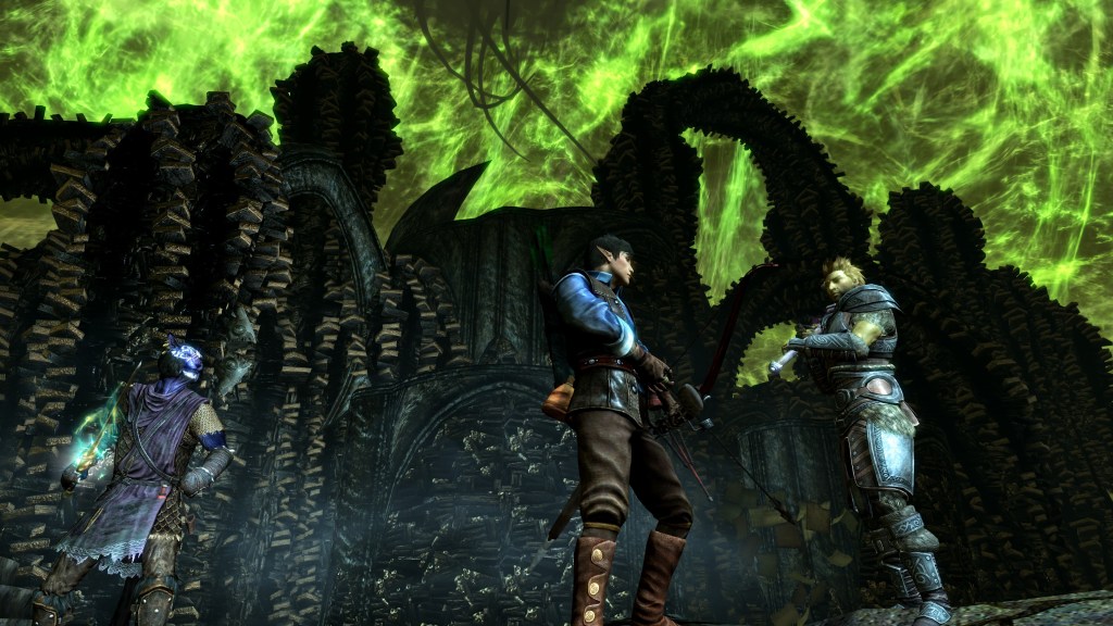 The quiet that met their arrival was unnatural. Gaeolin looked out on the sea of green water and writhing tentacles that had been his first view of Apocrypha. He nocked an arrow, hoping desperately that this time would also be his last in the library. “Stay close. I’m sure Miraak knows we are here. I don’t want us to get separated.”
