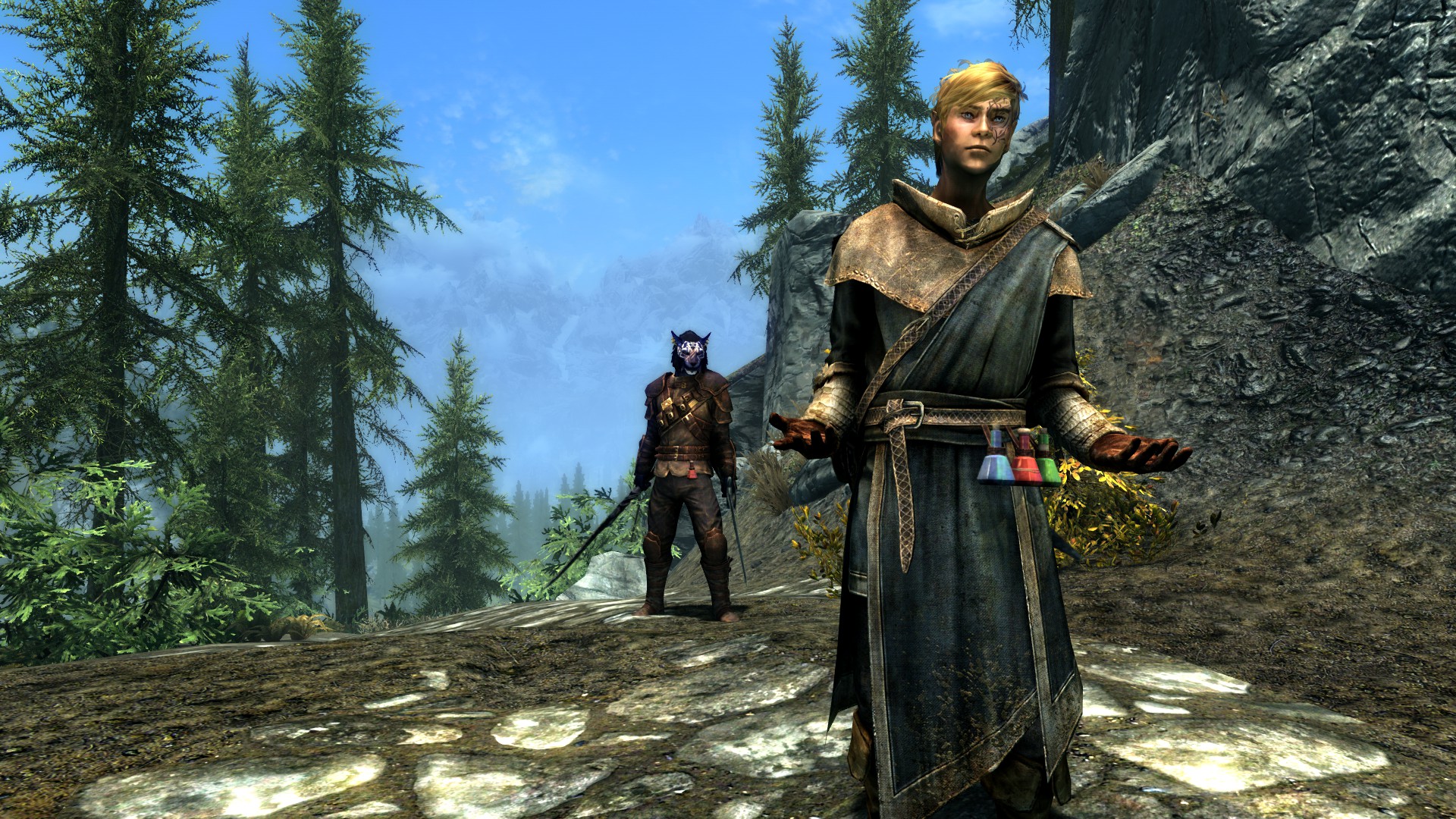 There was logic in this. Even without being armed as his friend was, the robes he wore had already been noticed a few times on their journey. Each time they were seen, someone asked him if he was from the college of Winterhold. And while this was not the case, their would be robbers would not have any means of disproving it. “Okay, you’ve convinced me. How do you want to play this?”