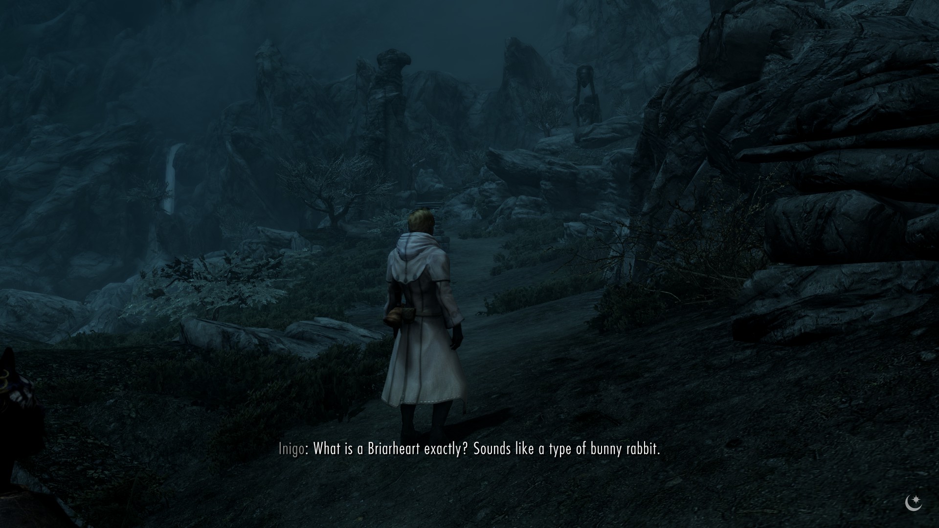 The pair traveled in silence for a while. A low rumble of thunder rang through the crags, giving a booming undertone to the light pattering of the rain against the stones. Feeling like he had once again opened up a sore topic with his friend, Noren instead tried to practice the spell he had been studying since they had left Riften. He reached for the magicka, bringing his hand up into a shushing gesture. The tip of his finger began to shimmer with a pale blue light. “Sassi Varoth.” The light flared, wrapping around his hands and beginning to wind down his body. The magic swirled around his boots for a moment before seeping into the leather. The footwear dulled, but did not lose their newfound shimmer. Inigo twisted an ear back, turning his head when the sounds of his friend’s footsteps disappeared.
